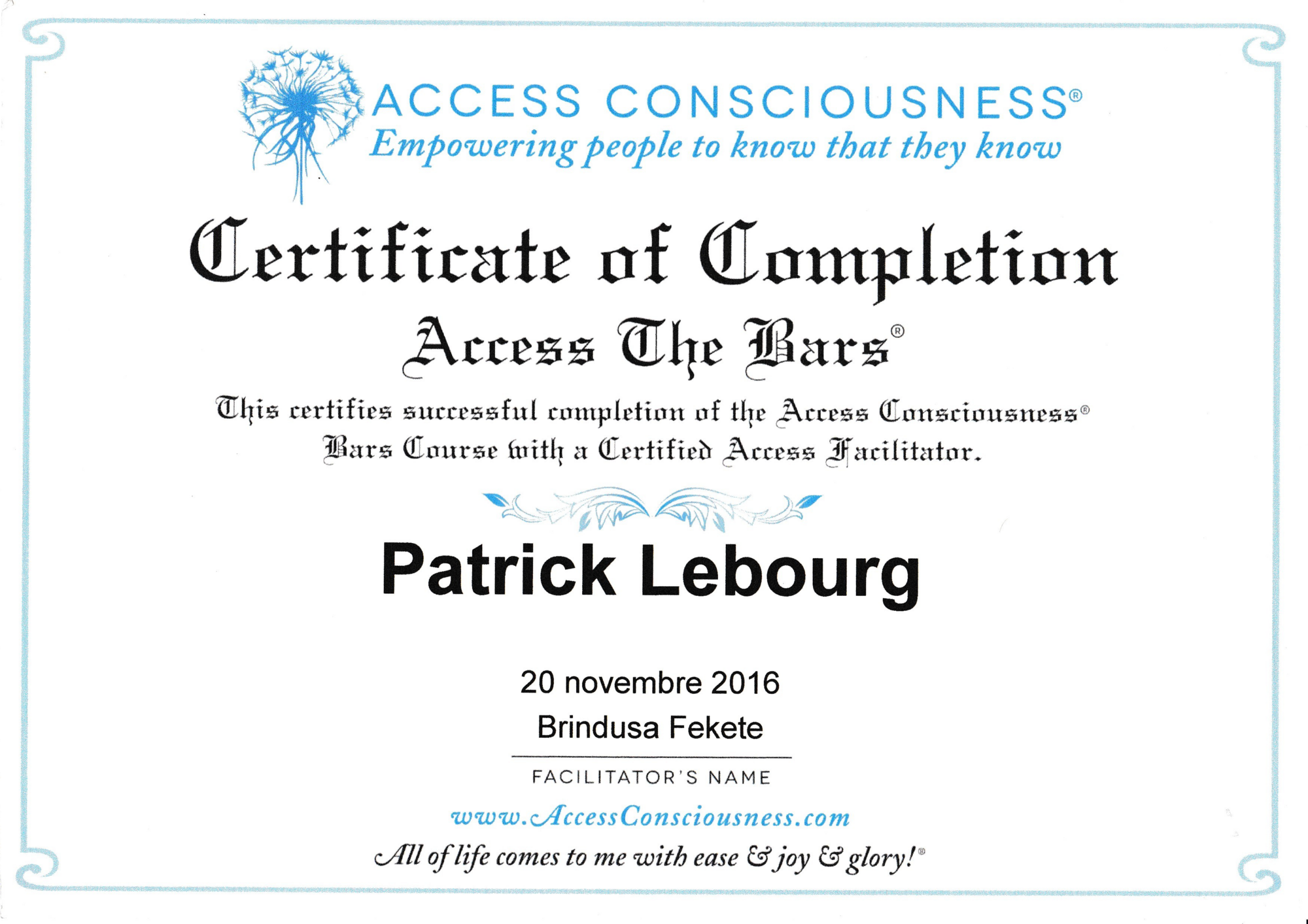 "J ai fait une séance d access bar il y a 1 mois environ J ai eu une grosse migraine juste après Mais depuis rien et je me sens beaucoup plus détendue, les choses négatives ont moins d emprise sur moi, je dors mieux et Patrick Lebourg a un très bon contact, il met à l aisé et est très à l écoute Je recommande "